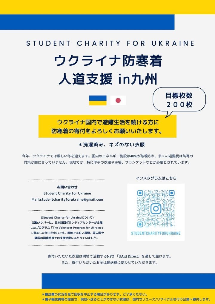 Aid drive to Ukraine November 28, 2022 at 09:17 JST 2022 π Aid drive to Ukraine Location: William Kumamoto International Center William Kumamoto International Center is helping run a drive for aid to Ukraine: β View original post on Facebook For a link to the original post on Facebook, open this page on a computer. β 2022-11-28 08:52 JST 2022-11-28 09:29 JST β Around this time β¦ 2022-12-01 01:32 JSTTake what you pick direct sale at Chibusan Yokaen 2022-11-30 00:03 JSTKirk here feeling old -- partly because I'm in my 60s but β¦ 2022-11-29 10:37 JSTCarlton. Revealing to a degree my age and time in Japan, I β¦ 2022-11-28 10:16 JSTKumamoto Caste Illumination 2022-11-28 09:29 JSTChuck Waterman here: 2022-11-28 09:17 JSTAid drive to Ukraine (this post) 2022-11-28 08:52 JSTKirk here sharing a link to the 2022 Summer YOKA: 2022-11-27 06:09 JSTJapan vs Costa Rica Football Match 2022-11-27 02:39 JSTγ¦γ―γ©γ€γι²ε―ηδΊΊιζ―ζ΄inδΉε· 2022-11-27 00:41 JSTKirk here with a photo from Aso Farmland via the "Engrish in β¦ 2022-11-26 10:09 JSTKirk here with some photos of Japanese maples and some notes β¦