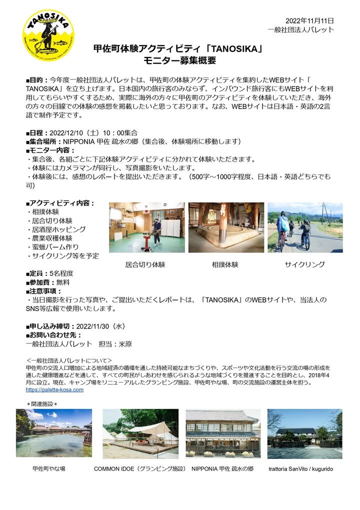 Anyone keen to join a monitor tour in Kosa on Saturday, Dec. 10th (10am~)? They are looking for about 5 international participants. For more info fill out the form online https://palette-kosa.com/contact or, if you are confident in your spoken Japanese, call 096-234-8871 (NIPPONIA - as per address below).
