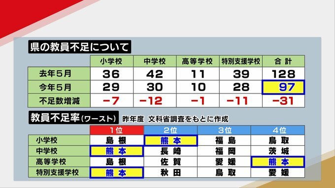 Kirk with news about Kumamoto’s teacher shortage. The images are from a video of an RKK news broadcast and the webpage that presents that video. According to the RKK report, Kumamoto’s teacher shortage is more severe than that of any other prefecture. The total number of unfilled slots was 97 as of May of this year. Even that is an improvement over the last year’s 128 but, in comparison to other prefectures, the situation in Kumamoto is currently the worst.