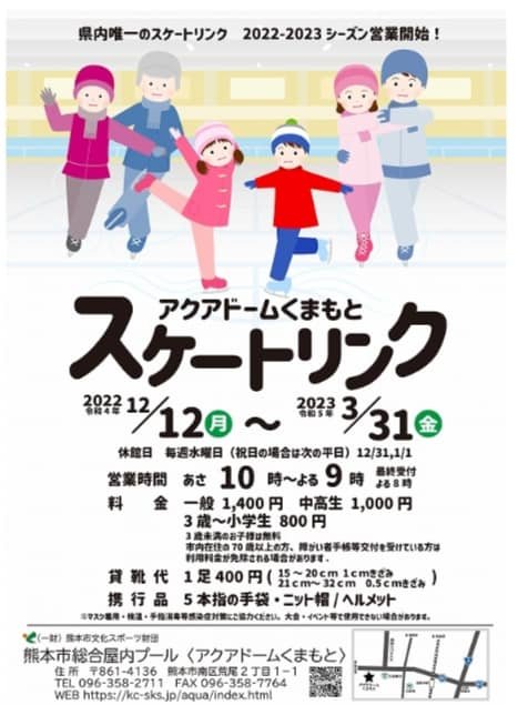 Merry Christmas! Atsuko here. Are you enjoying winter? I went skating yesterday for the first time in three years at the Aqua Dome in Kumamoto City. Yes, I went there before the Corona Commotion. Before corona started spreading. there was a free day on the first day it opened, and I used to go there every year, but the free day seems to have disappeared since Corona. There were times when the ice rink was not open during the years when regulations were strict, but I think it was just the comfortable number of people. The fee is 1400 yen for adults, 1000 yen for junior high and high school students, 800 yen for elementary school students and younger, and 400 yen for rental shoes. If one adult goes, the fee for elementary school students is halved to 400 yen. Don’t forget to bring gloves and socks. Knit caps are available if you have them. Helmets can be rented for free. Hoping you also enjoy skating!!ଘ(੭ˊ꒳ˋ)੭✧
