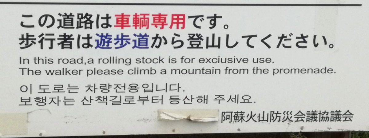 それなのになぜ標識や看板の翻訳はあれほどひどいのか。小さな店などであればGoogle翻訳を活用した翻訳でも問題ないであろう。しかし、阿蘇山は道の整備や山を魅力的にするために大量の資金が使われている観光名所である。