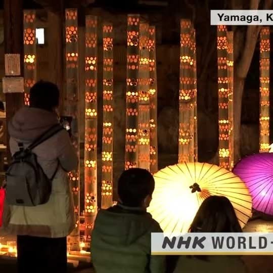 — start quote — The center of Yamaga City in Kumamoto Prefecture lights up on winter nights. A total of 5,300 bamboo tubes lit with candles and Japanese umbrellas illuminated by lights filled the street of 300 meters. The event called “Yamaga Toro (lantern) Hyakka Hyakusai” was launched 20 years ago by local businesses to attract tourists. Due to the impact of COVID-19, the event was held for the first time in three years. — end quote —
