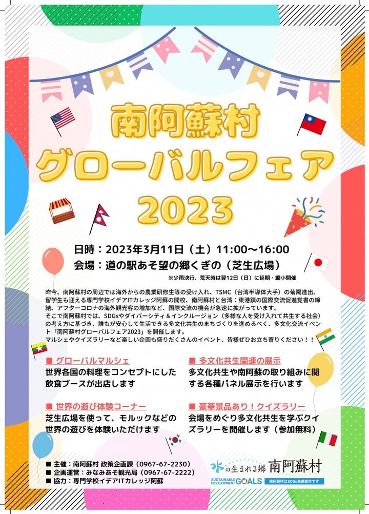 Joha(nnes) here from Minamiaso Village. There is an upcoming multicultural event here in Minamiaso Village (Michi-no-eki “Aso-bō no sato”, Kugino) on March 11, 2023. The event aims to promote a better understanding of multicultural residents in general and of course provide an opportunity to catch up with other residents from abroad in the rural areas of Aso. Details can be found at the link below. https://www.vill.minamiaso.lg.jp/kiji0032350/index.html