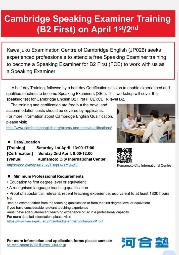 Fiona here, passing along an opportunity for English teachers who wish to become Cambridge English testing examiners. The training takes place at the International Centre on April 1st and 2nd, and requires registration and relevant experience.
