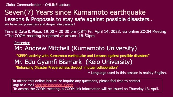 Kirk here (following Atsuko’s lead) with another item for the many Andrew Mitchell fans among our readership. As you can see in the image, Andrew will be one of two presenters in an English-language event to be held online on April 14th – the anniversary of the start of the shaking in 2016. I will be in the zoom session primarily as a listener. If you would like to join us please write to Mr. Yagi of the Kumamoto International Foundation at [email protected].