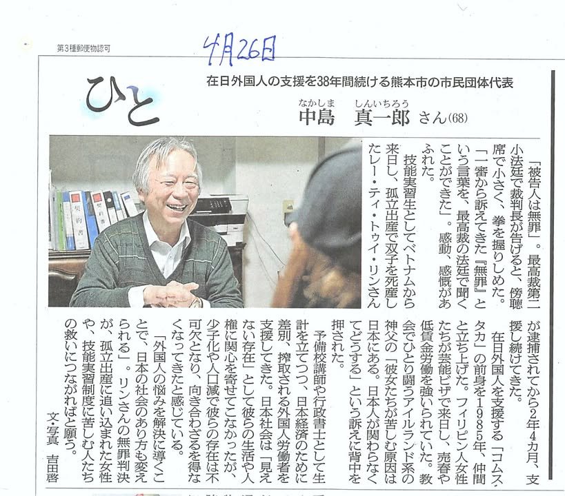 Mr. Nakashima has worked continuously to help non-Japanese people living in Kumamoto since founding Kumustaka in 1985. The article says that the words of an Irish priest led him to become active: “The problems these women face are caused by Japanese people. Japanese people need to step in to help them.”