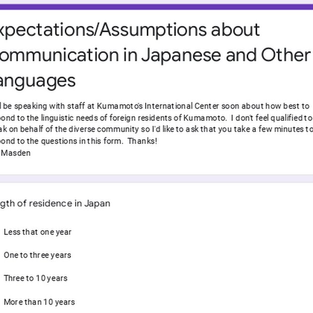 I will be speaking with staff at Kumamoto’s International Center soon about how best to respond to the linguistic needs of foreign residents of Kumamoto. I don’t feel qualified to speak on behalf of the diverse community so I’d like to ask that you take a few minutes to respond to the questions in a Google form that I put on the web: https://forms.gle/Rng33mFfCa2KM4XW8