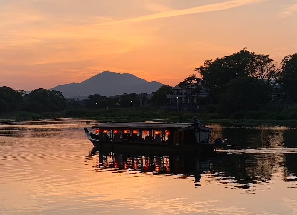 Kirk here. Today I posted about a wrestler named Kinbouzan. I didn’t plan it this way but my wife and I happened to go to Ezuko this evening for a walk and came across this view of the mountain. The boat (a yakatabune; 屋形船) is operated by Eto Boat House. Earlier in the afternoon there were lots of people out on smaller boats that the boat house rents out.