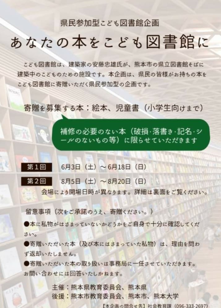 ●We will not return the donated book (and any personal items that were placed in the book) for any reason. ●Handling of donated books will be entrusted to the Secretariat. We cannot respond to inquiries. Organizer: Kumamoto Prefectural Board of Education, Kumamoto Prefecture Supported by: Kumamoto City Board of Education, Kumamoto City, Kumamoto University Inquiries about this project] Social Education Division (096-333-2697)