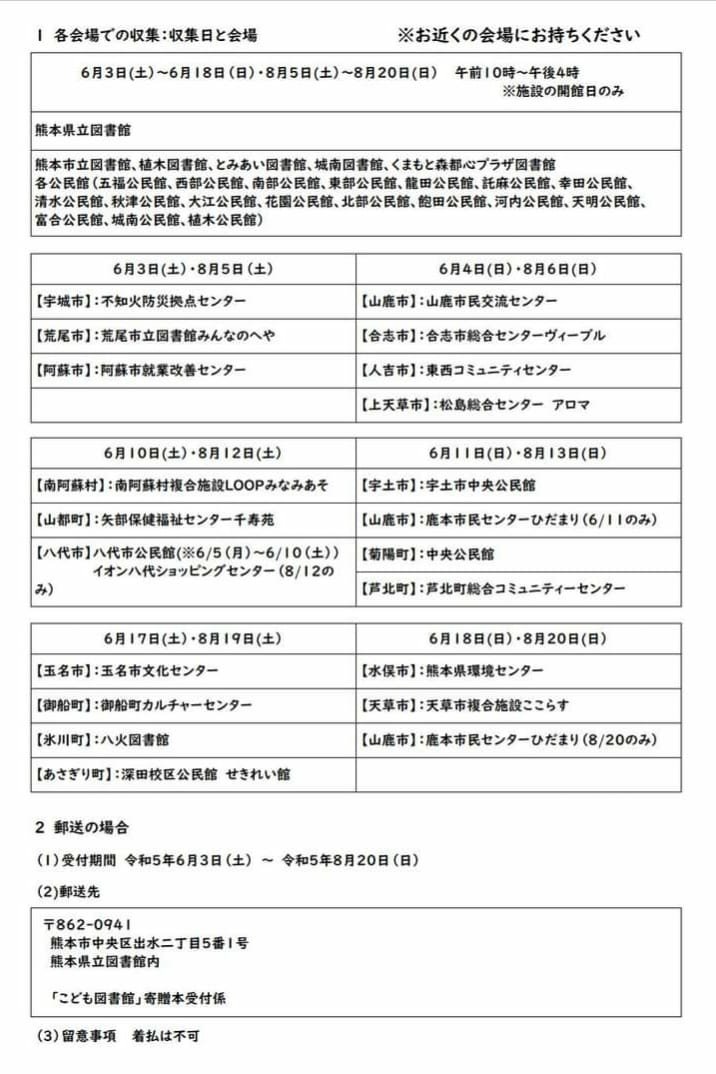 Kumamoto Prefecture will be accepting donations of picture books and children’s books at various locations around the prefecture from Saturday 3 June. Please donate at your nearest location!