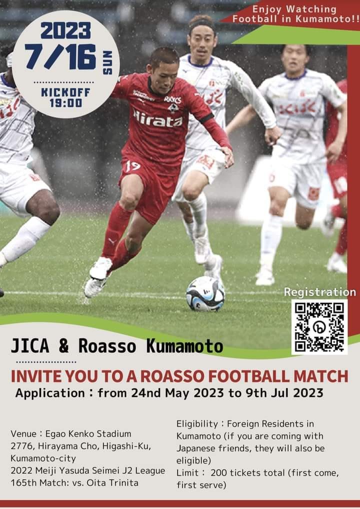Atsuko here. Kumamoto Professional Football Team “Roasso” invites foreign residents in Kumamoto to watch the home match at Kumamoto Park Dome on Sunday 17 July.