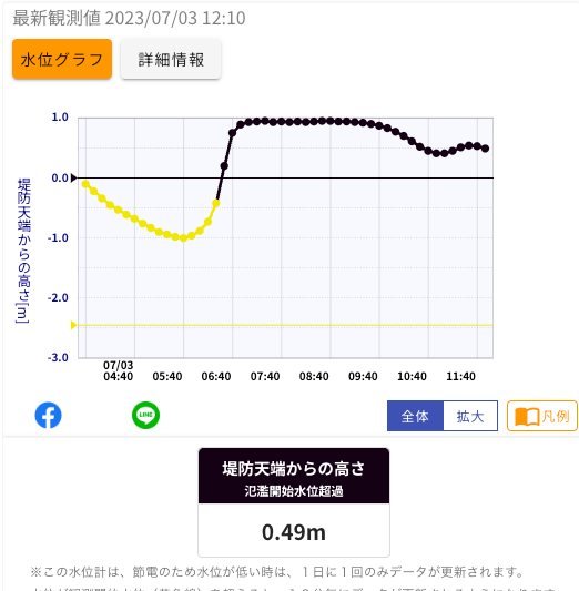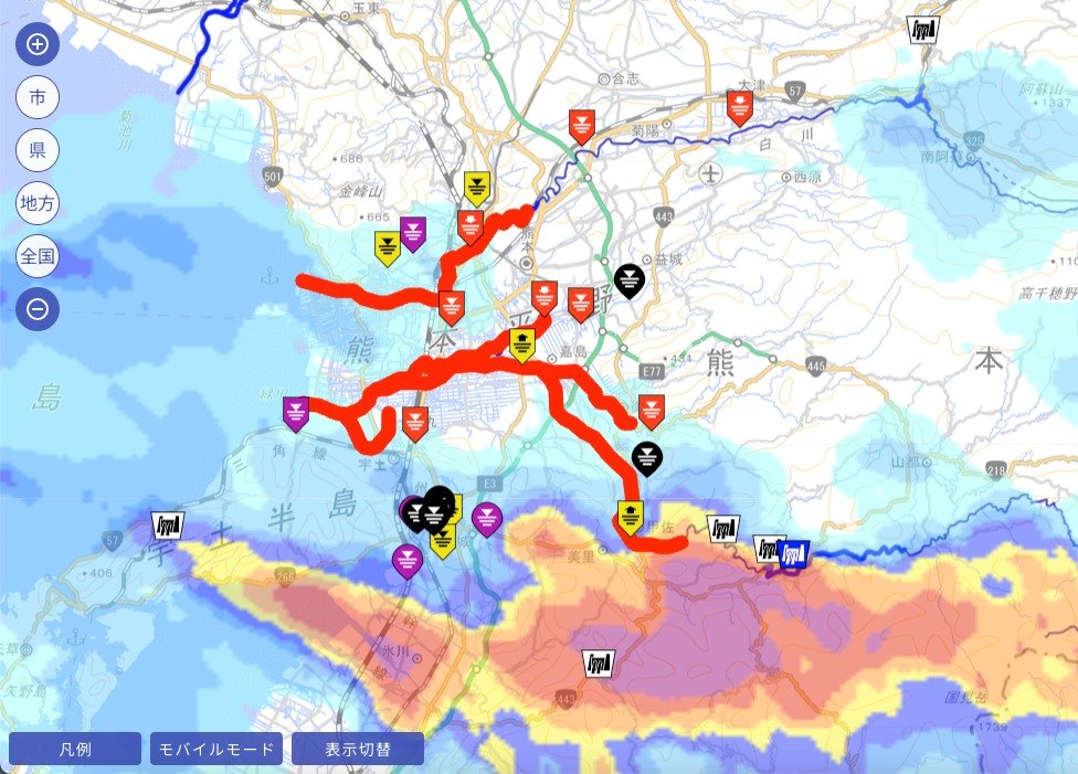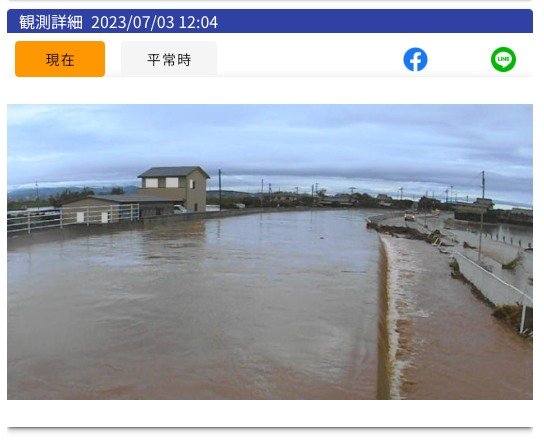 As an illustration, I’ve added screenshots of the Shinkawa Bridge, which is on the Iwatogawa, in Mashiki-machi. The data indicates that the water level is higher (!) than the levee. You can see what that looks like in the live photo. Even if you don’t read Japanese, this map should help you learn about the current status of the riiver(s) near you.