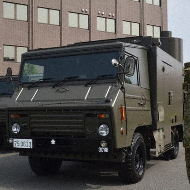 “A masked GSDF member stands by NEWS electronic warfare vehicles at Camp Kengun in the city of Kumamoto. (Mainichi/Yoshitake Matsuura)”