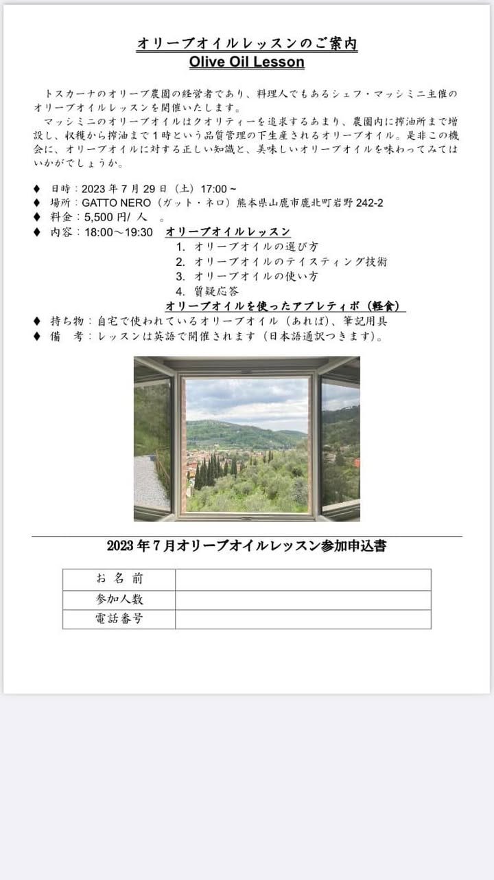 (Claire) Hi, GattoNero, an Italian restaurant with an Italian chef , Yamaga way in Kahoku, will be holding their second Olive oil tasting/seminar on July 29th. It will be in English with Japanese translation. My sister in law went last time and really enjoyed it. You can message them through Instagram in English, Italian or Japanese or phone them in those languages too for more information. 0968 32 4333