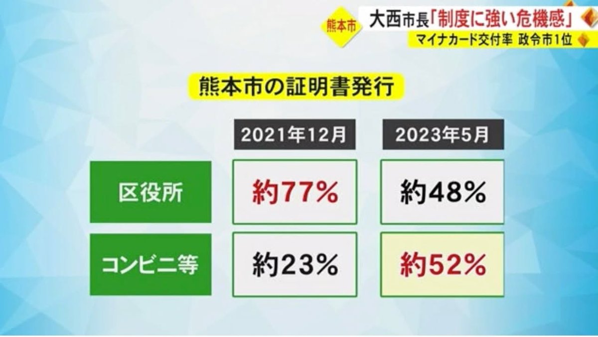Kirk with some news about “my number cards” (maina cards). Kumamoto City has achieved the highest adoption rate (78%) of 20 ordinance-designated (seirei shitei; 政令指定) cities. Moreover, “maina cards” have made it possible to get certain documents (residence registries [juumin-hyou], etc.) for only 10 yen each a local convenience stores. This has led to over half of all such documents in Kumamoto being procured at convenience stores rather than at ward offices. Personally, I’ve found this to be very convenient and you can’t beat that 10 yen price! :)
