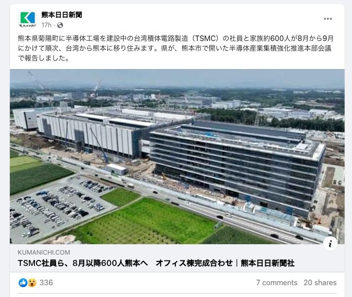 Kirk here with a share from the Kumanichi Shimbun. The headline says that 600 TSMC employees will arrive in August and begin working in a newly constructed office building.