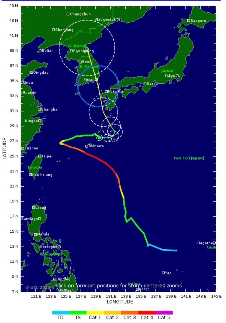 It looks like the storm will come fairly close to Kumamoto around Wednesday or so but, fortunately, it will probably be considerably weaker by that time. The yellow color indicates that it will probably be a Category 1 typhoon (according to the site’s categories), down from a much, much nastier Category 4.