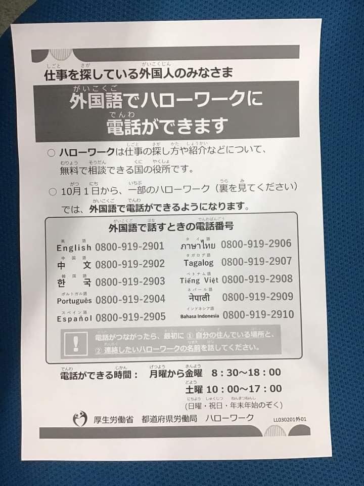 Atsuko, with the information that Hello Work can also provide help in foreign languages. This announcement seems to have been made a long time ago, but as it is from October, I thought it might be useful to share it with you.(๑•̀ㅂ•́)و✧ ーーーーーーーーーーーーーーーーーーーーーーー For foreigners looking for work. You can call Hello Work in a foreign language. ○Hello Work is a government office where you can get free advice on how to find a job and referrals.