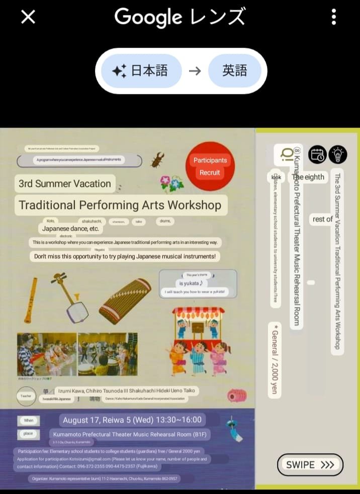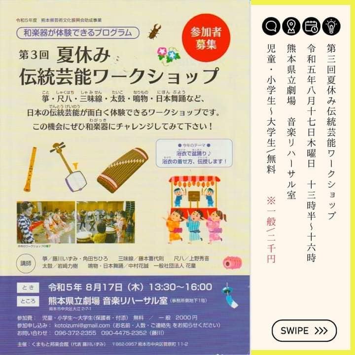 Atsuko here, sharing experience Japanese musical instruments, Koto, shakuhachi, shamisen, taiko drums, Japanese dance, etc. The taiko drumming teacher is from the taiko team I was part of before Corona. This is a fun chance to touch and play Japanese instruments such as the koto and shakuhachi. Free for children, ¥2,000 for adults. Hoping you can enjoy it(๑˃ᴗ˂)و♡ ーーーーーーーーーーーーーーーーーーーーーーー Thursday 17 August, 13:30-16:00. 3rd Summer Workshop for Traditional Performing Arts @ Kumamoto Prefectural Theatre Music Rehearsal Room