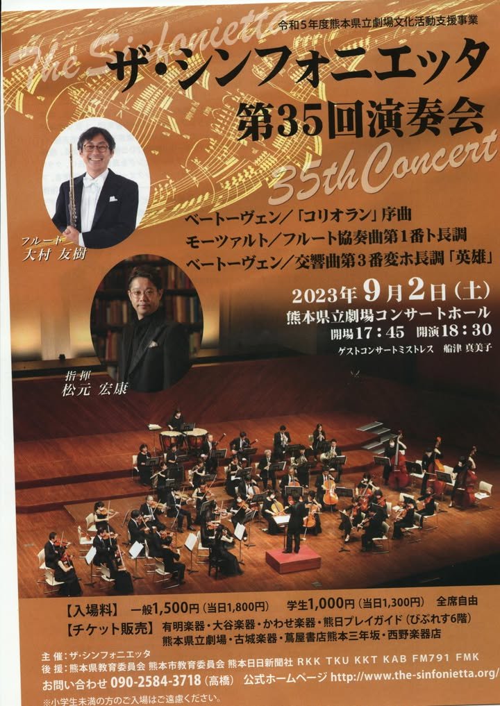 Hi everyone, Joe Tomei here. The Sinfonietta is having their annual concert on 2 Sept (Saturday). We will be playing Beethoven’s overture to Coriolan, Mozart’s 1st Flute Concerto and Beethoven’s 3rd Symphony (Eroica) and the Kenritsu Gekijo. The annual concert is usually in the afternoon, but this time, the doors open at 17:45 and the concert starts at 18:30. If you purchase a ticket before the event, it is slightly cheaper, so if you are interested, please let me know!