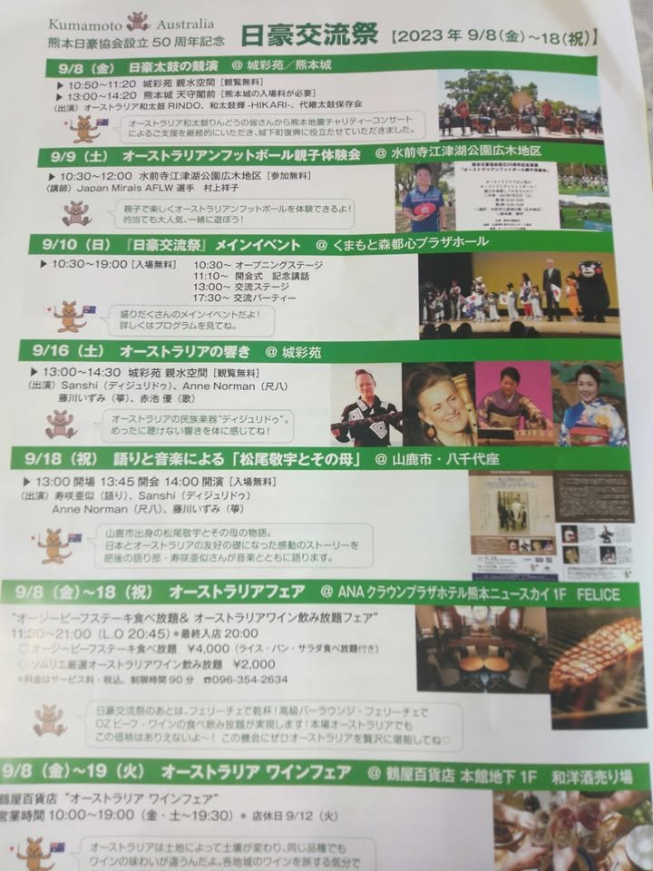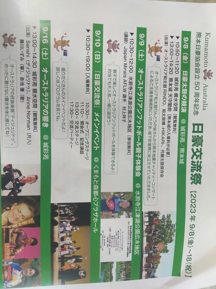 The koto teacher is on the board of the Japan Australia Society, which has taiko and other instruments. (They were looking for participants for the Kumamon Gymnastics and Penguin Parade). The Japan-Australia Exchange Festival runs from 8 to 18 September. For more information.(๑˃ᴗ˂)و♡ https://www.kumamoto-australia.com/50%E5%91%A8%E5%B9%B4%E8%A8%98%E5%BF%B5%E3%82%A4%E3%83%99%E3%83%B3%E3%83%88