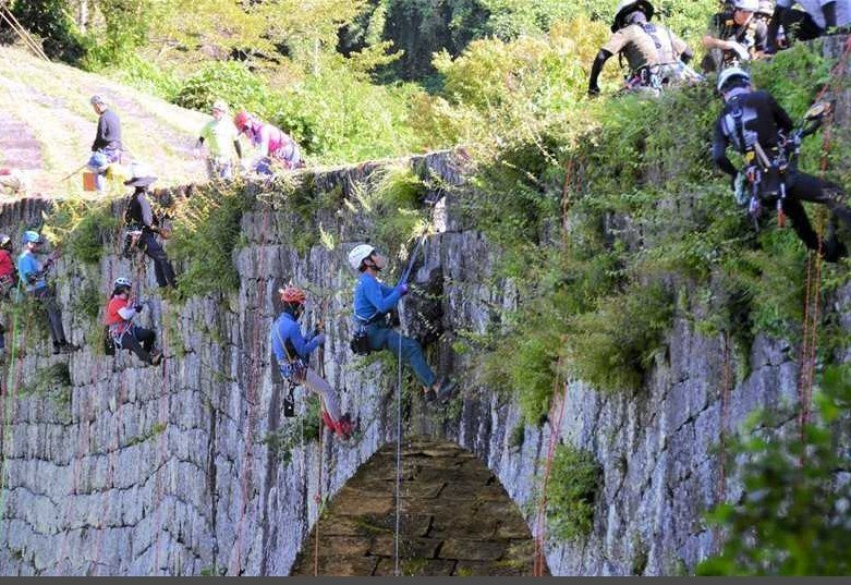 Kirk here with my rather infrequent series on weed removal. Pulling out weeds is hard enough on flat surfaces. To remove the weeds that grow on the sides of a stone bridge such as Tsujunkyo you need rock climbers. And, I would imagine that an appropriate insurance policy would also be good to have.