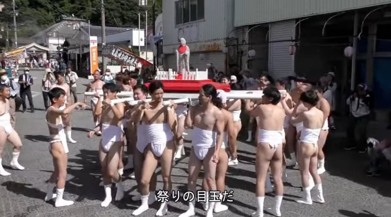 The mikoshi (religious palanquin or portable Shinto shrine) you see is called “yuusou hadaka mikoshi” (勇壮裸みこし) .