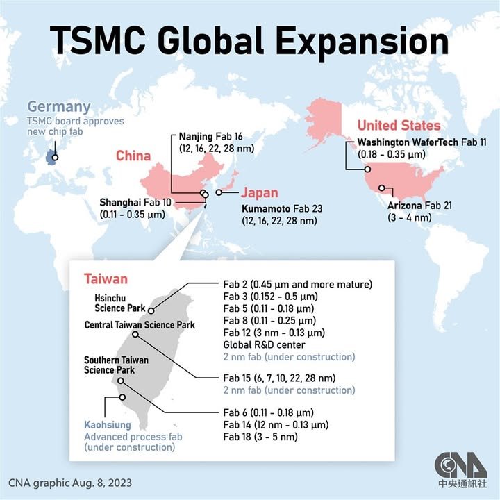 Kirk here with an introduction to an article titled “TSMC Kumamoto fab expected to spur Taiwanese investment in Japan.” The most interesting aspect of the article to me was the graphic you see. Kumamoto is Fab 23 (fabrication plant no. 23) and will be producing chips that have transistors that are between 12 to 28 nanometers big. This is not as good as what is produced in Taiwan where 3 nm chips are already being made and 2 nm chips are in development. The size of the chips is important “because the smaller the size of a single transistor, the [more] tightly they can be packed together” thus making faster, more powerful chips: