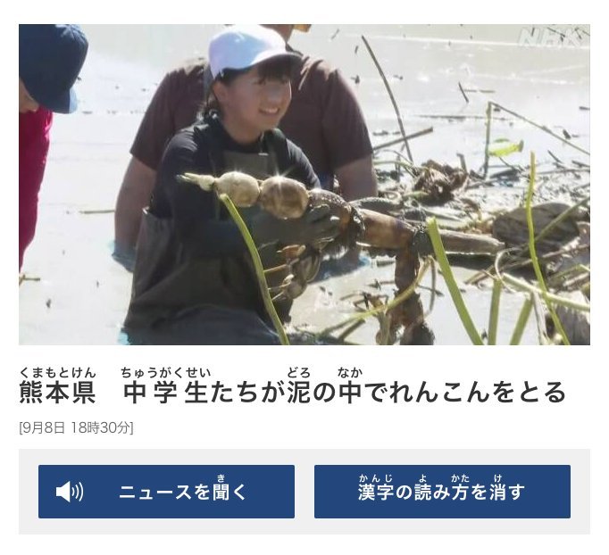 Kirk here with something for people interested in improving their Japanese. As you can see, NHK’s NEWS WEB EASY site provides articles with furigana (to show the readings of words). Moreover, they let you control what you see. You can turn the furigana on and off and you can choose between simplified Japanese and the original article. I think it’s a great study tool. (I wish I had something like this when I was getting started.) This article is about kids in Amakusa learning about renkon (lotus roots).