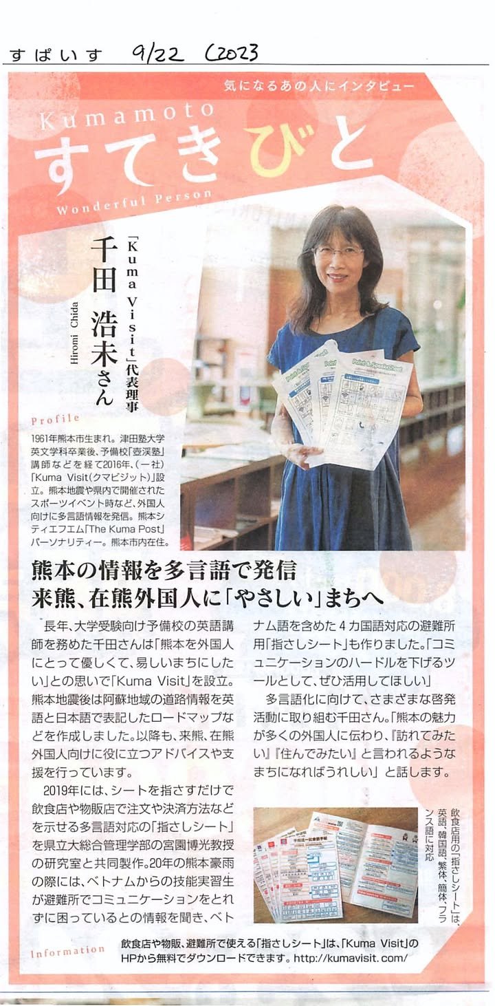 Kirk here reporting that Hiromi Chida, founder of Kuma Visit, got written up in Kumanichi Spice. Congratulations Hiromi! The article mentions her Facebook page, which I hope most of you already know about: