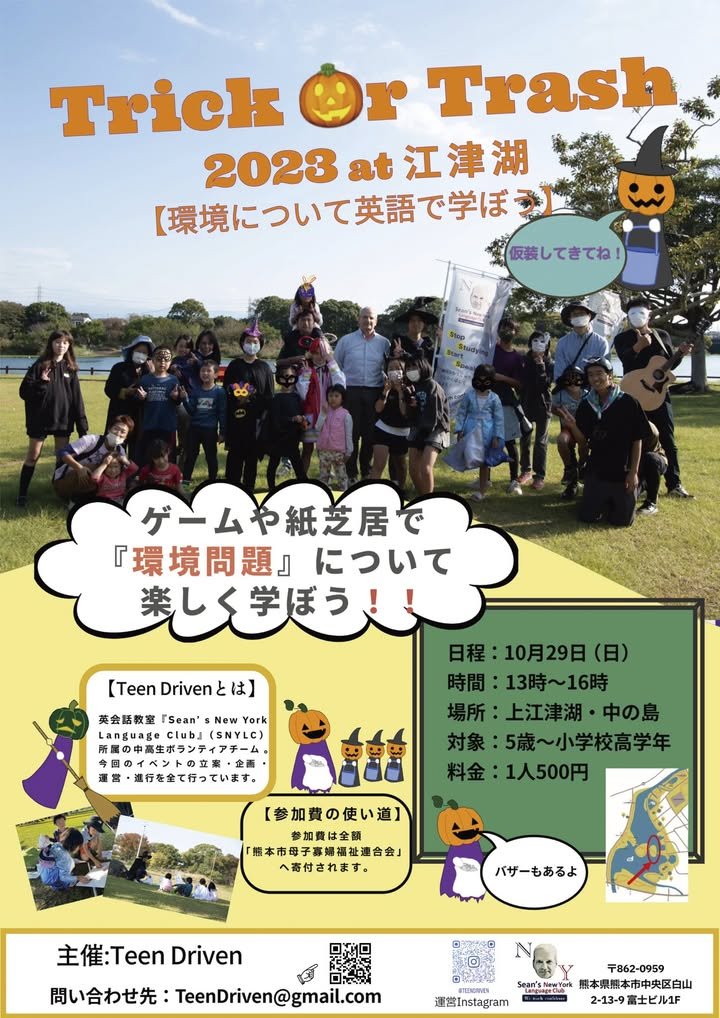 Sean here- この度私たちは、キッズ向けハロウィンイベント「トリック・オア・トラッシュ2023」を開催する運びとなりました。このイベントは、未来を担う子どもたちに環境問題を英語で学ぶ機会を提供するもので、今年で4回目となります。企画・運営は全て、Sean’s New York Language Club(SNYLC)所属の中高生ボランティアチーム「Teen Driven」が行います。