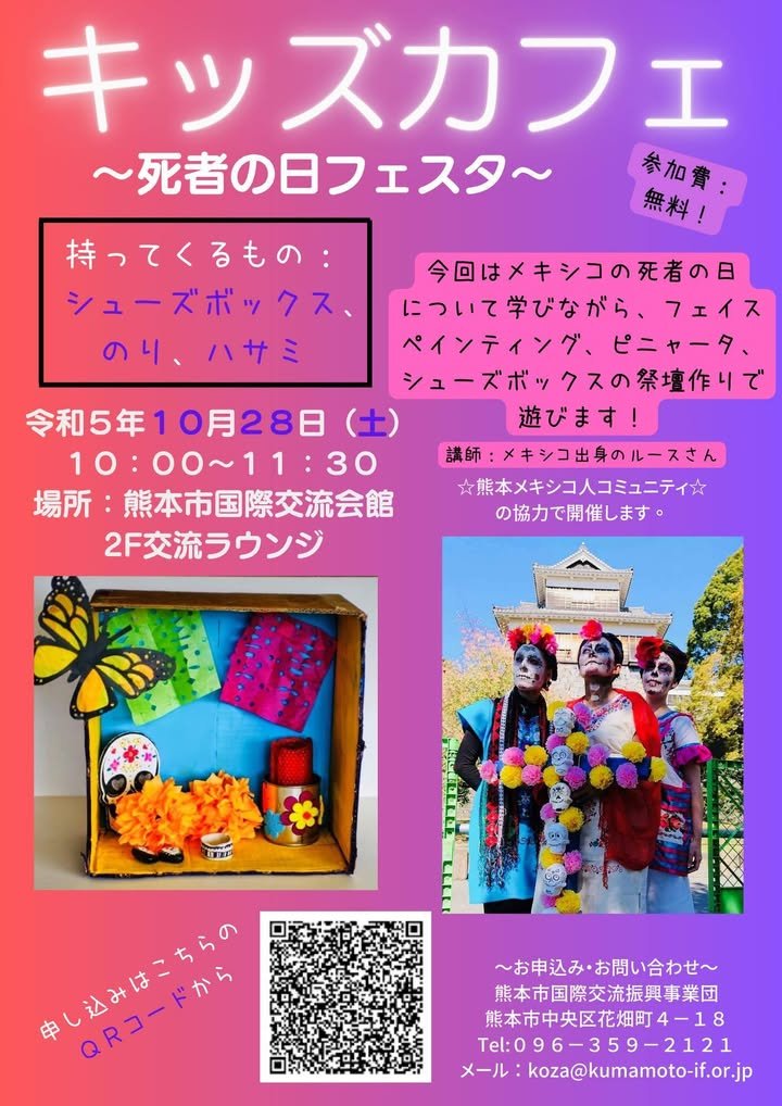 William Later is better than never, particularly when death is concerned. Our local Mexican community is planning an exhibition at the International Center to celebrate el Día de Muertos, or Day of the Dead, tomorrow morning (Saturday) at 熊本市国際交流会館(Kumamoto City International Center)The purpose is educational, to instruct on the roots and meaning of this important holiday. There will also be face painting, a piñata, and, if you bring a shoe box, a chance to create your own altarpiece. Please plan to visit - before it’s too late!