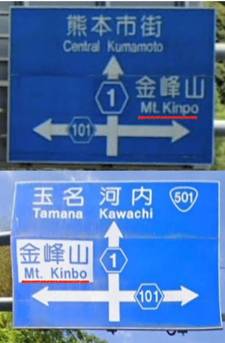 Kirk with a note on whether it’s “Kinbozan” (my personal favorite) or “Kinpozan,” another fairly popular reading of 金峰山. These are images of two signs that are very near Toge no chaya. People are told to say “Kinpo” when they head toward Kumamoto and then “Kinbo” when they leave. So, next time you think “Didn’t that sign say something else when I came?” don’t worry about your sanity; it really did.