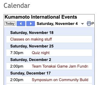 Kirk here. I added some events to the “Kumamoto International” calendar, which is pinned to the top of the page: