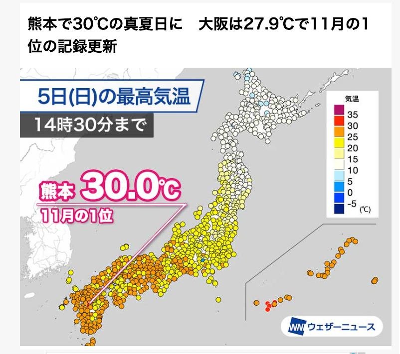 Kirk here. The temperature in Kumamoto got up to 30° Celsius (about 86° Fahrenheit) – an all-time record for November.