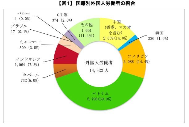 Kirk here with some statistics on “foreign workers” in Kumamoto. The category of “foreign worker” includes people like me (I’m a worker in the educational sector) but would not include foreign students at my university. I’m not completely sure but I think that the foreign children (those without Japanese citizenship, even if born here) may account for rest of the gap between the total foreign population (now nearly 20,000) and the approximately 15,000 figure in the report.