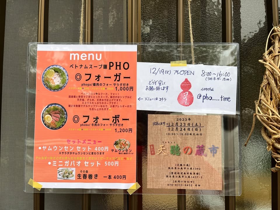 Time (タイム), the pho restaurant that was next to the Kengun McDonalds, has reopened in their new place next to Kumamoto zoo. Their hours are 8 to 4 (check their instagram for their holidays) and my wife and I braved the snow (all 3 flakes) to have a pho ga and yam un sen set. There are 5 parking spaces, 3 on the road and two behind the restaurant. Instagram is here https://www.instagram.com/pho___time/