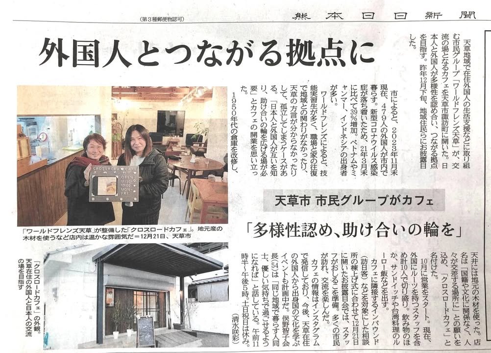 A civic group in the Amakusa area, “World Friends Amakusa,” dedicated to supporting the lives of foreign residents, has opened a café in Suwa Town, Amakusa City, to serve as a place of interaction. The café aims to be a hub where Japanese and foreigners acknowledge and connect through diversity. It was introduced to the local residents in late December last year.