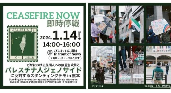 Unfortunately, I cannot attend the demonstration today due to my schedule, but I can share it with you. I hope that the voices from Kumamoto will be heard๐*ใ https://m.facebook.com/story.php?story_fbid=10228051063213532&id=1582731582 ใผใผใผใผใผใผใผใผใผใผใผใผใผใผใผใผใผใผใผใผใผใผใผ Standing demonstration against the genocide in Palestine January 14 2024 14:00-16:00 In front of New-S, Kumamoto