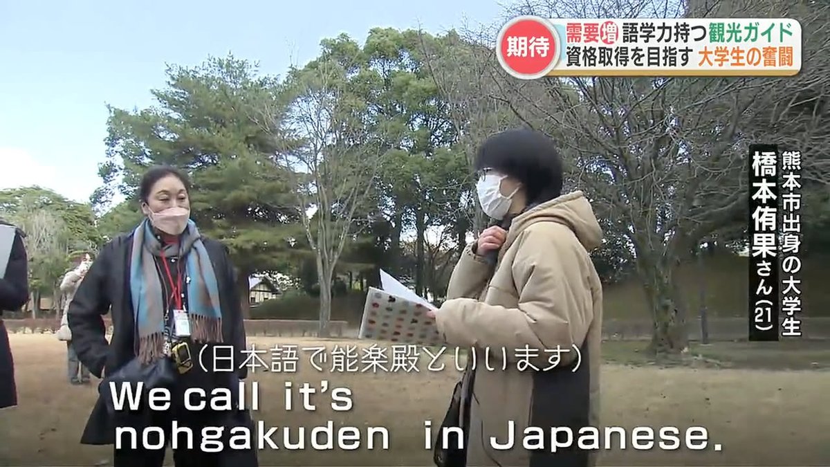 Kirk here. The student shown in the image you see actually said ‘We call it nohgakuden in Japanese’; the mistake is that of whoever put the subtitles on the video at RKK. The TV report is about how this university student is studying to become a certified English-language guide.