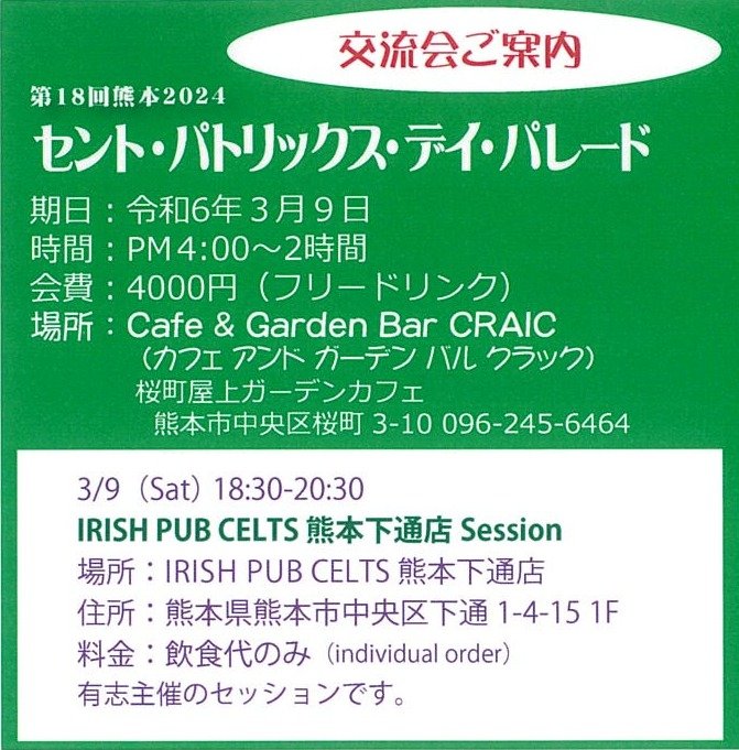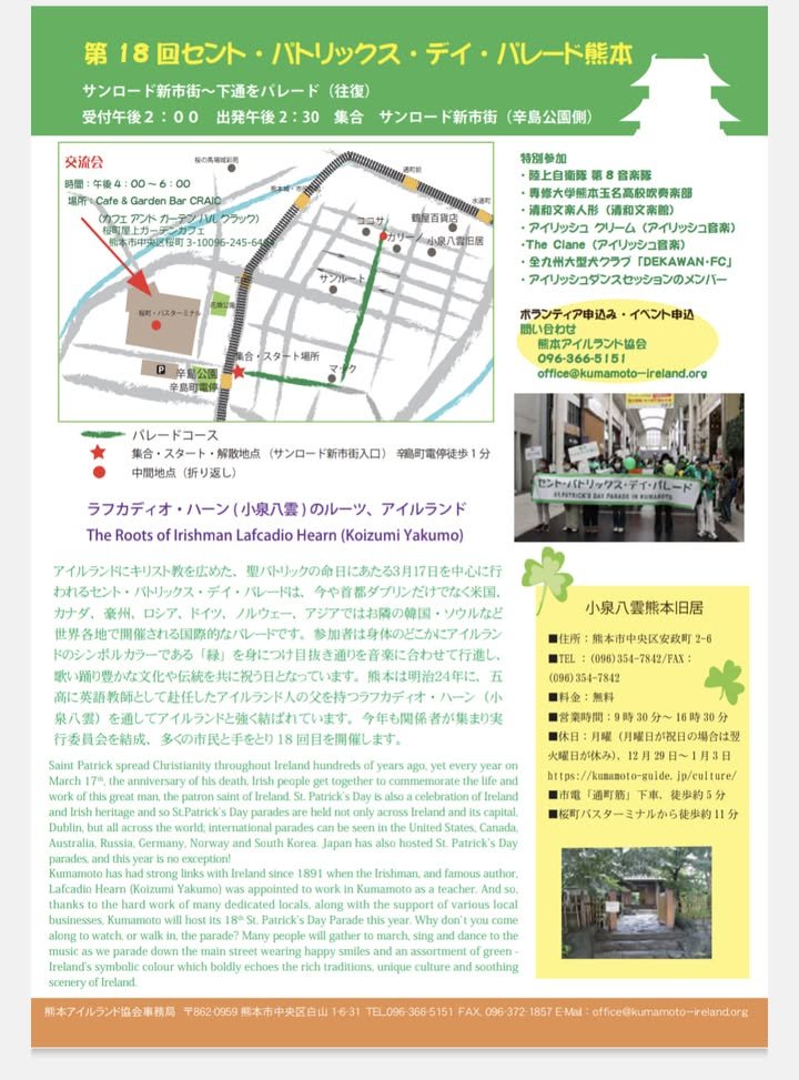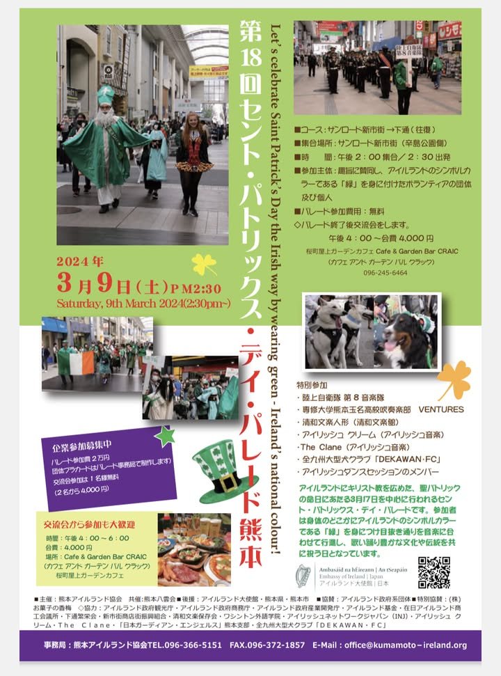 Ireland’s Saint Patrick’s Day parade will be held in Kumamoto next Saturday, 9th March from 2:30pm, with the start at SunRoad Shinshigai 🎶🎻 We’ll gather from 2pm!! ☀️ The real date is always March 17th, so don’t forget to wear something green both days this month - to keep your lucky charms intact!! Anyone can join in the parade, so bring your ‘green genki’, tricolour or spoons!!! アイルランドのセント・パトリックス・デーのパレードが来週の3月9日(土)の14時半〜、熊本市で開催されます - サンロード新市街で、14時から集合。本番は3月17日なので、今月は2日間とも緑色の服を着るのをお忘れなく💚 自分の"グリーン元気"を見せてください!!!! ☘️ Ruth from Ireland!