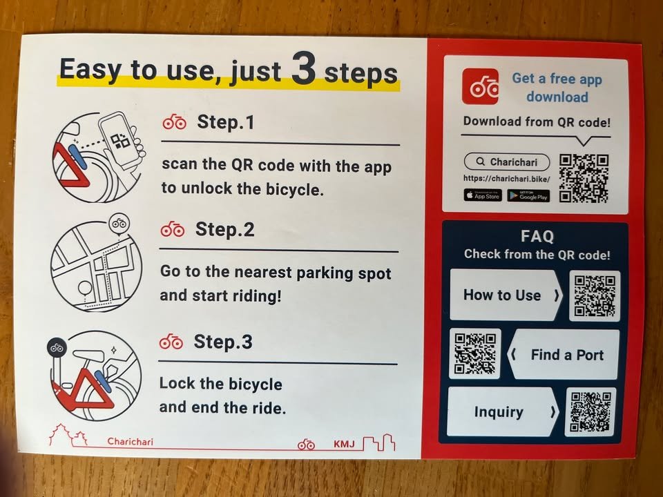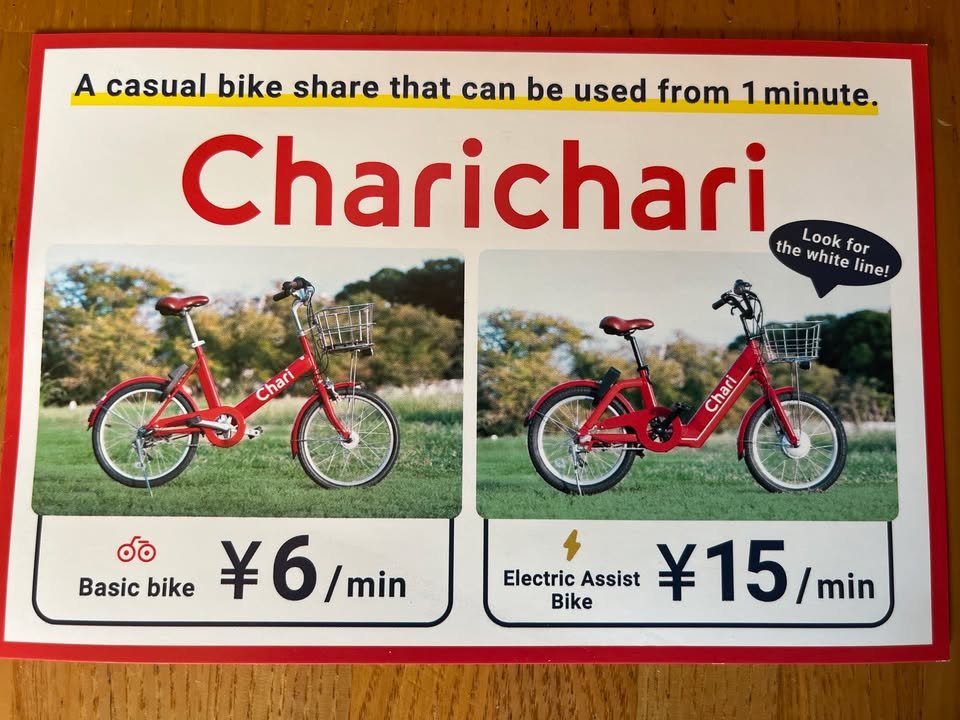 Joe Tomei here, apologies is this has been posted before but I picked up this English postcard for the red Charichari bikes that have popped up around town explaining the process. I’ve never used one so anyone who has experiences with the bikes, please comment!!