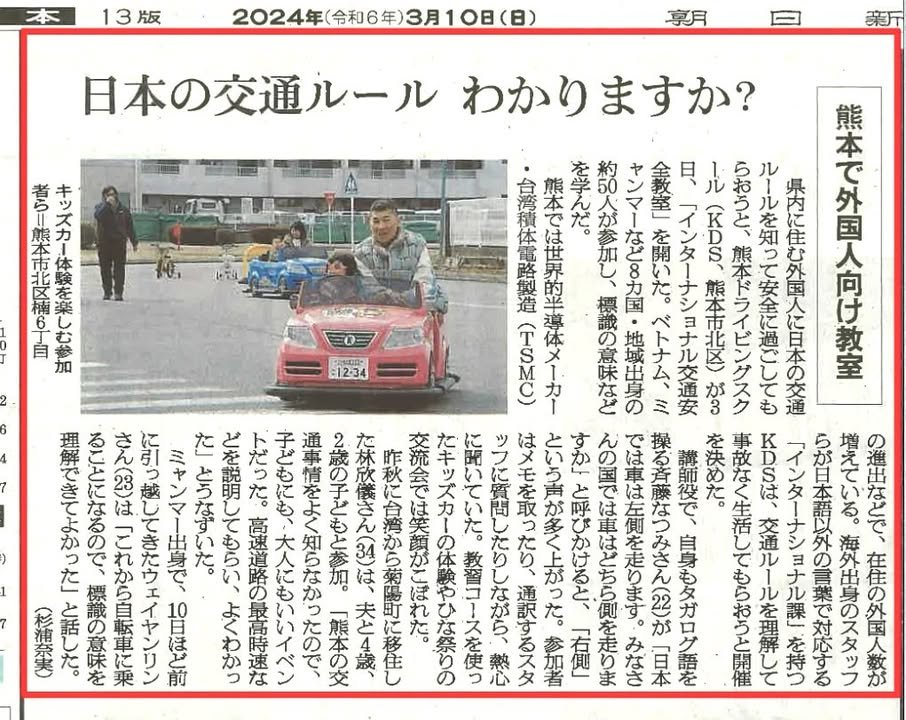 Kirk here. The image you see is of a newspaper (Asahi) article about KDS (Kumamoto Driving School) classes in various languages for foreigners. There have been several Japanese-language media reports about such classes, most or all of which are indexed on the school’s website at the following address: