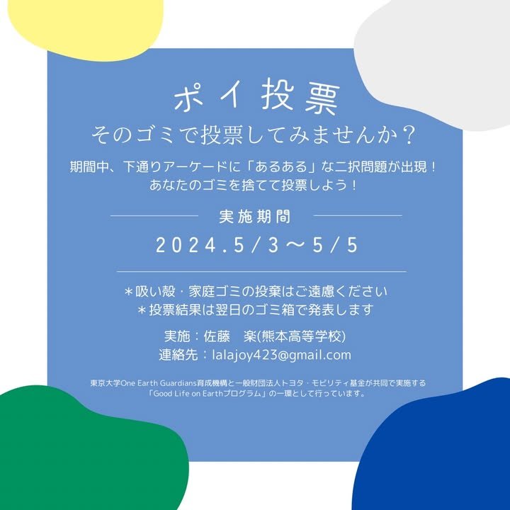 Trash Gets Fun! Dispose of trash with trivia questions in this playful event. It’s from May 3rd to 5th at Shimotori, mark your calendars! Participate, have fun, and show your love for the planet! 📣GWは下通で楽しくゴミを捨てちゃおう📣 楽が @goodlife_on_earth で取り組んでいる プロジェクト【ポイ投票】。 「ポイ捨て」と「投票」をかけ合わせた言葉です。 2つのゴミ箱と看板を設置し 思わず投票したくなるような二択クイズを用意。 ゴミを捨てることで投票に参加してもらいます。 投票形式のゴミ箱があれば、ゴミをポイ捨てせず ゴミ箱に捨てたくなるのではないか。 そんな発想から生まれたプロジェクトです。 この企画の肝は「ゴミを捨てる」という行為を 楽しめるものとして再定義したこと。 投票という遊び心のある行動に置き換えることで 気軽に参加してもらい 環境問題について考えるきっかけを提供する とてもユニークで面白い取り組みです。 心理学を応用して、ゴミ捨てを「やらなくちゃ」から 「やりたい」に変えていく。 彼が小学生の頃に思いついたアイディアを GLE の力を借りて形にしました。 そしてこの度、下通繁栄会のご協力を得て GW中の5月3日〜5月5日の3日間 熊本市中心街・下通にて 社会実装に向けた実験を行います。 お近くをお通りの際は ぜひお立ち寄り・応援お願いします😘 そして偶然にもゴミをお持ちであれば ぜひご参加いただけると幸いです😂 【ポイ投票】社会実験 2024 GW 期間: 2024.5.3〜5.5 時間: 11am〜7pm 場所: 熊本市中央区下通 内容: 二択クイズの投票形式でゴミを捨てる社会実験 目的: 楽しくゴミを捨て、環境問題への関心を高める 【参加方法】