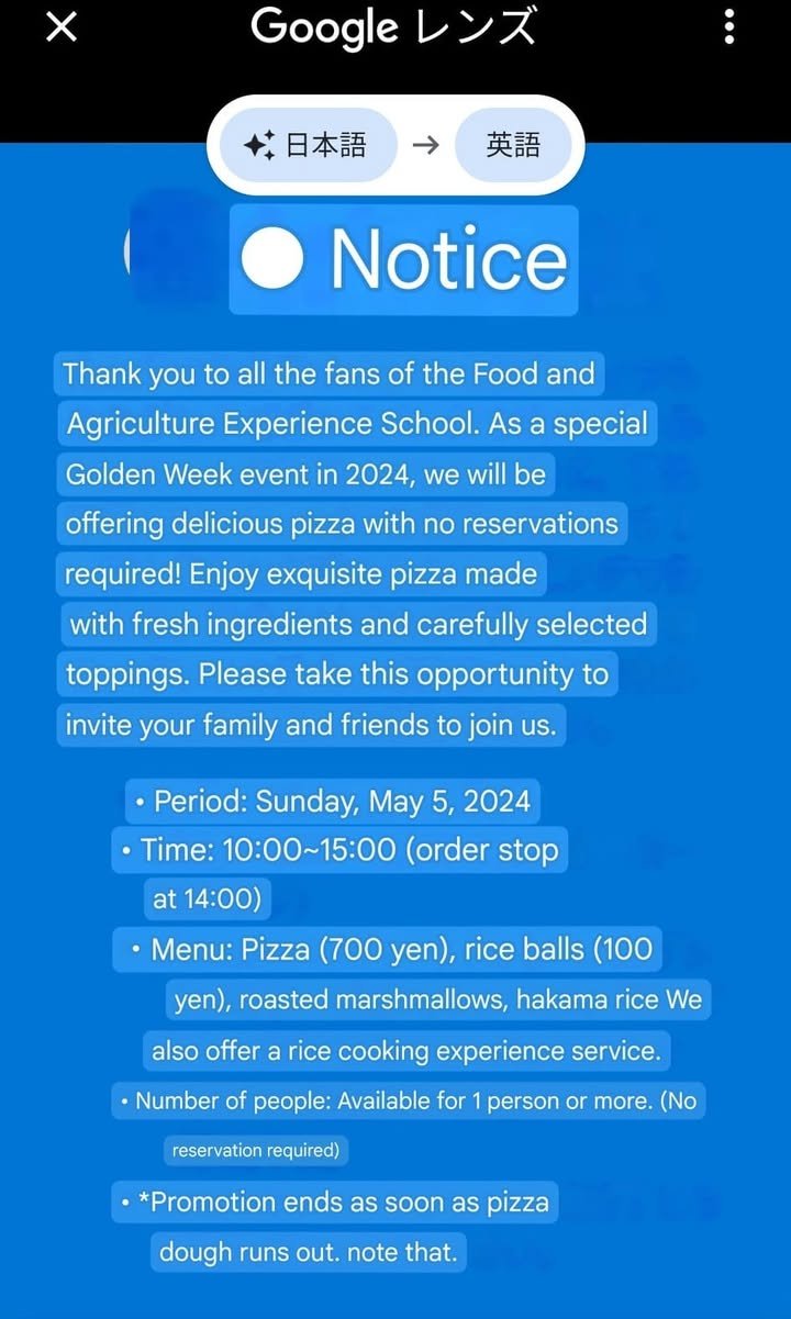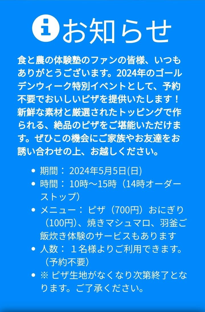 May 5, 2024 ,ONLY Time: 10:00~15:00 (order stop at 14:00) Menu: Pizza (700 yen), rice balls (100 yen), roasted marshmallows, hakama rice We also offer a rice cooking experience service. • Number of people: Available for 1 person or more. (No reservation required) *Promotion ends as soon as pizza dough runs out. note that.