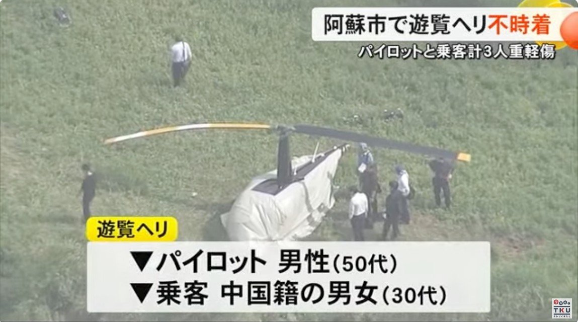 —- start translation —- Around noon on the 13th, a sightseeing helicopter made an emergency landing in Aso City, leaving a total of three men and women, including the pilot and passengers, with serious and minor injuries. Although the fuselage of the helicopter that made the emergency landing remains intact, parts of the tail rotor are scattered, telling the magnitude of the impact. [TV Nishinippon reporter Kenta Sato, from the heliport] “This is above Aso City, Kumamoto Prefecture. A helicopter can be seen making an emergency landing in an open space. A white sheet has been placed over the aircraft.” Just after noon on the 13th, a call was made to the fire department reporting that “a sightseeing helicopter had an engine failure in mid-air and made an emergency landing” near the nursing home facility ‘Miyamasou’ in Kurokawa, Aso City. It is reported that there were a total of three people on board the helicopter: one man in his 50s, the pilot, and two men and women in their 30s, believed to be tourists from Hong Kong with Chinese nationality. According to the fire department, the male pilot suffered a suspected pelvic fracture and is in serious condition, while the male and female passengers complained of pain in their chests and backs and were taken to the hospital. They are conscious. According to the company operating the helicopter, the aircraft that made the emergency landing was a sightseeing helicopter heading from the nearby theme park ‘Aso Cuddly Dominion’ to the crater of Mt. Nakadake in Aso. The sightseeing helicopter took off around 11:50 a.m. and was scheduled to fly for about 7 minutes, but it made an emergency landing on a grassland 300 to 400 meters away from its intended destination. This is the footage from an information camera installed at Kusasenri just before noon on the 13th. On the right side of the screen, a helicopter can be seen heading from the direction of Mt. Eboshidake toward Mt. Nakadake and turning north. Although the footage alone cannot identify the aircraft as the one involved in the accident, it matches the scheduled time and flight route of the accident aircraft. No signs of trouble can be confirmed from the footage. [Staff of a nearby facility] “At the time, the sound of the helicopter was louder than usual. It didn’t particularly feel like it had crashed. I never thought it would crash.” According to the company operating the sightseeing helicopter, “no abnormalities were found during the pre-flight inspection.” The person in charge also stated that the cause of the emergency landing “may have been engine trouble.” —- end translation —-
