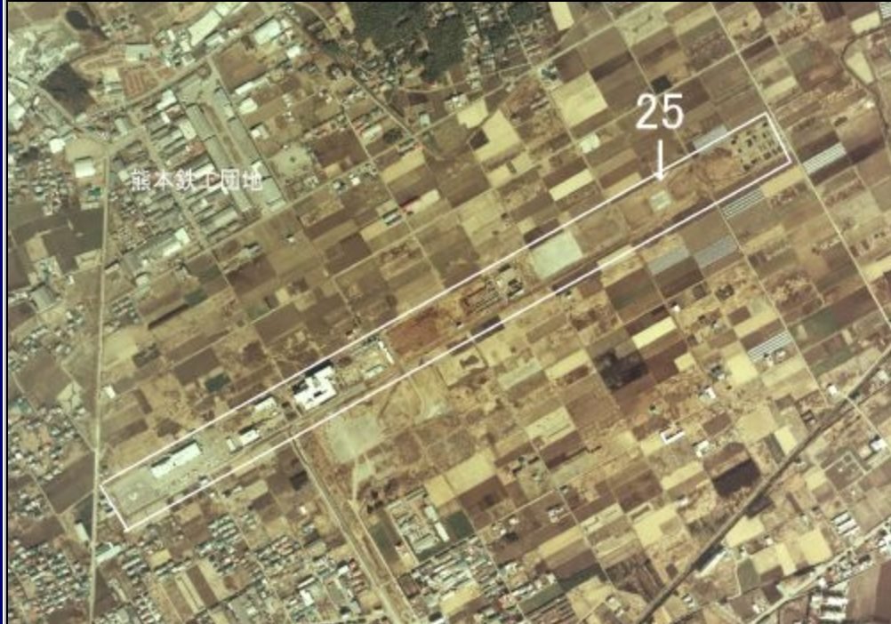 One page (link 4) had picture of where the airfield was, which I’ve included. Matching up with Google maps, this is the area that begins at the new Starbucks, up the Kokutai doro until the Mister Donuts on the corner. You can still find a few of the concrete structures that were part of the airfield on the left side of the street. Also, on the photo is marked 熊本鉄工団地 [Kumamoto Ironworks Complex], which is still an ongoing concern, with the name changed to Shin Nippon Stainless [新日本ステンレス工業鉄工団地].