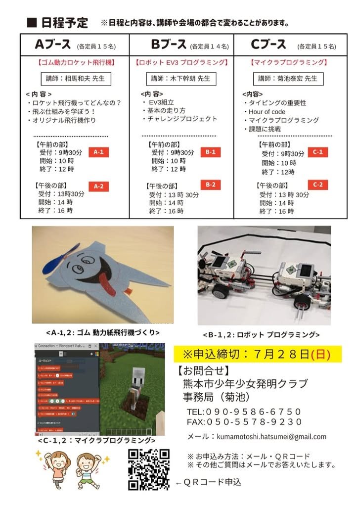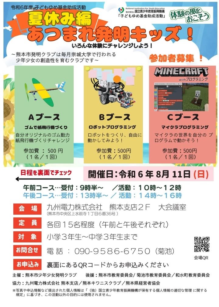 Unfortunately, lectures and explanations are in Japanese, but children should be fine. I also participate as a volunteer. I recommend programming, making things, etc. Kumamoto Boys and Girls Inventors Club is active all year round at Sojo University and other places, and if 8/11 is too difficult for you but you want to learn, please join the regular course as well. We are looking forward to seeing you. Atsuko( ˙-˙ )౨💗 ーーーーーーーーーーーーーーーーーーーーーーー Let’s try various experiences!