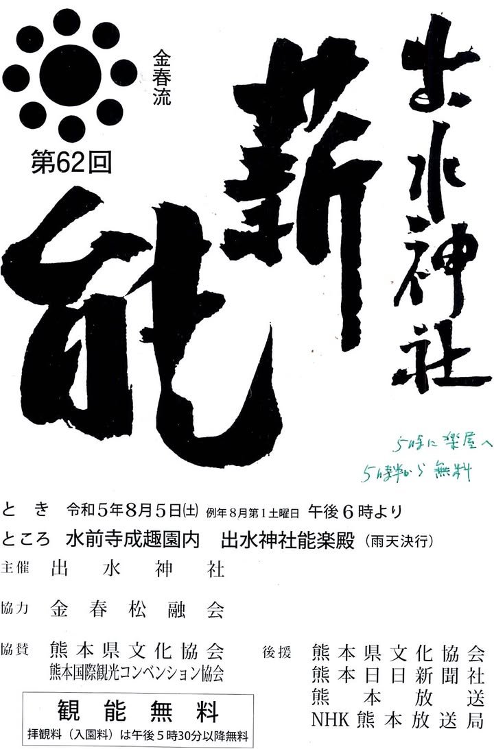Kirk here announcing that this year’s takigi (touch-lit) noh performance in Suizenji Park will be held tomorrow (August 3). The time of the evening and free admission will be the same as last year (see last year’s post, shown below). This year’s performance will be of Tamura, which you can read about in English here: