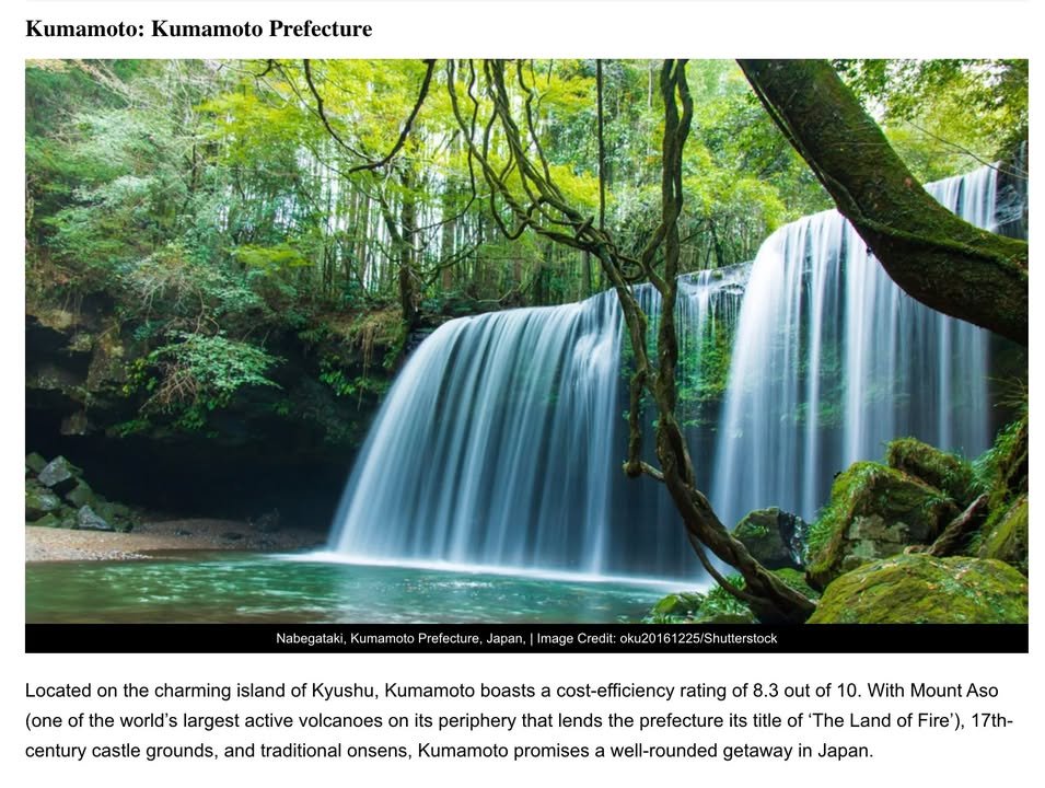 “Located on the charming island of Kyushu, Kumamoto boasts a cost-efficiency rating of 8.3 out of 10. With Mount Aso (one of the world’s largest active volcanoes on its periphery that lends the prefecture its title of ‘The Land of Fire’), 17th-century castle grounds, and traditional onsens, Kumamoto promises a well-rounded getaway in Japan.”
